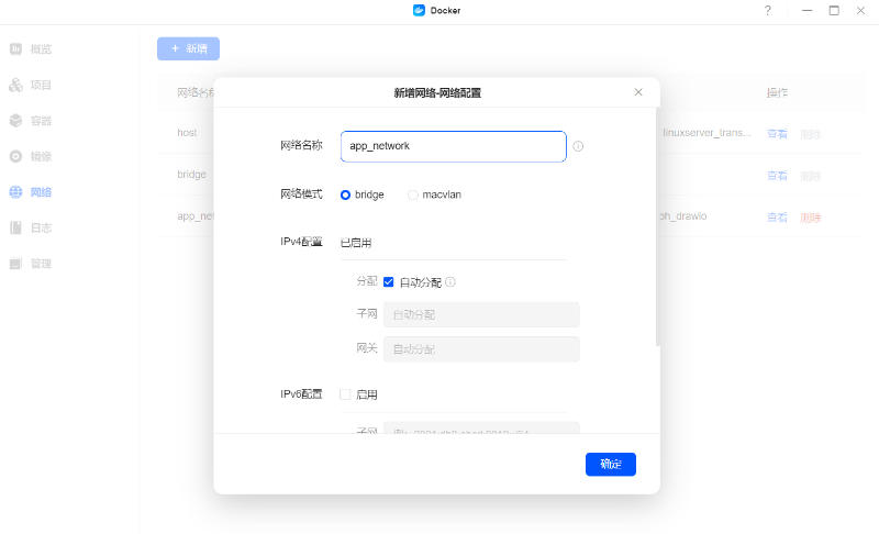 本篇文章及后续部署容器时均会使用app_network作为网络名称,若此处定义为其他名称,则后续部署时需要注意更换;网络模式:选择