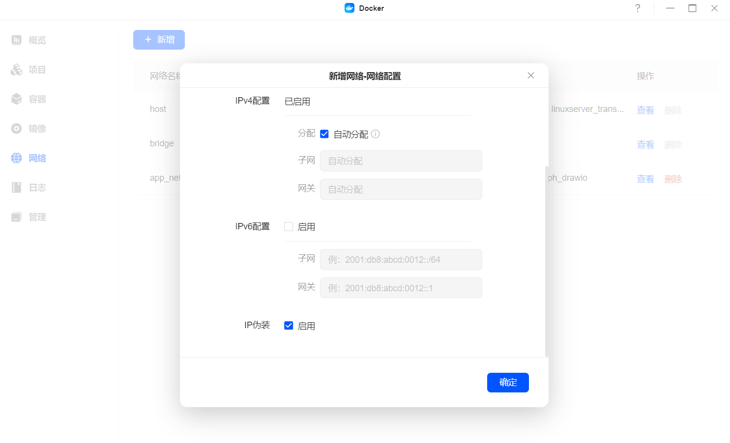 IPV6配置:不需要启用,若容器需要IPV6进行外网访问,部署容器时,网络模式设置