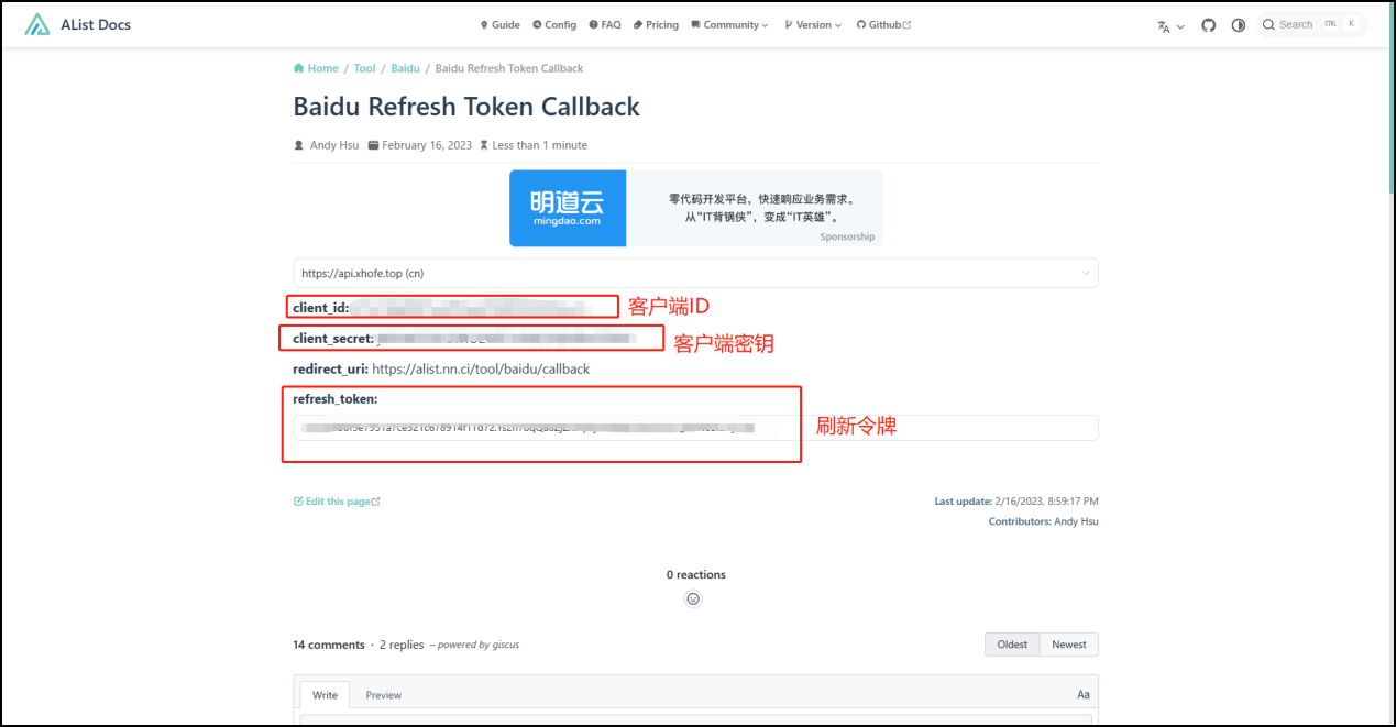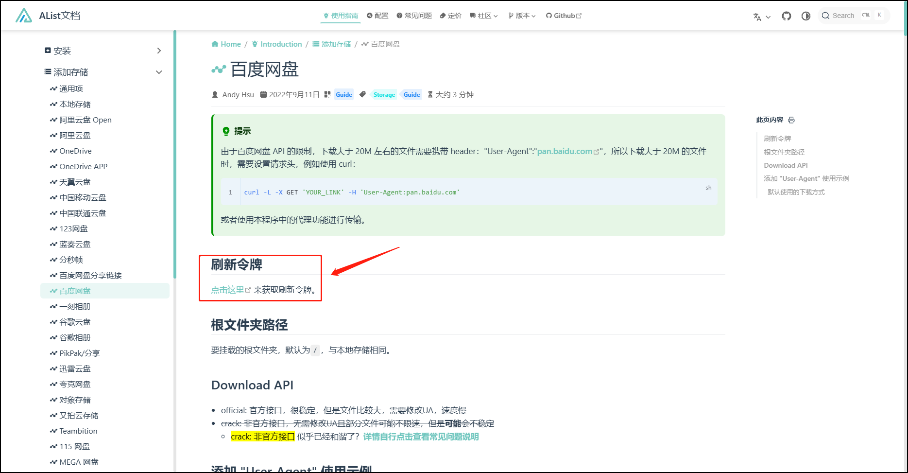 在 Alist 的官方文档找到百度网盘,下拉文章找到刷新令牌,点击刷新令牌获取密钥等内容。
